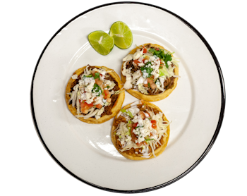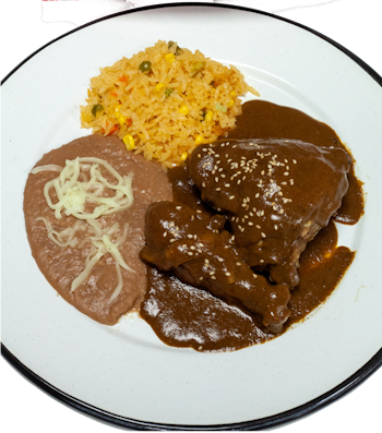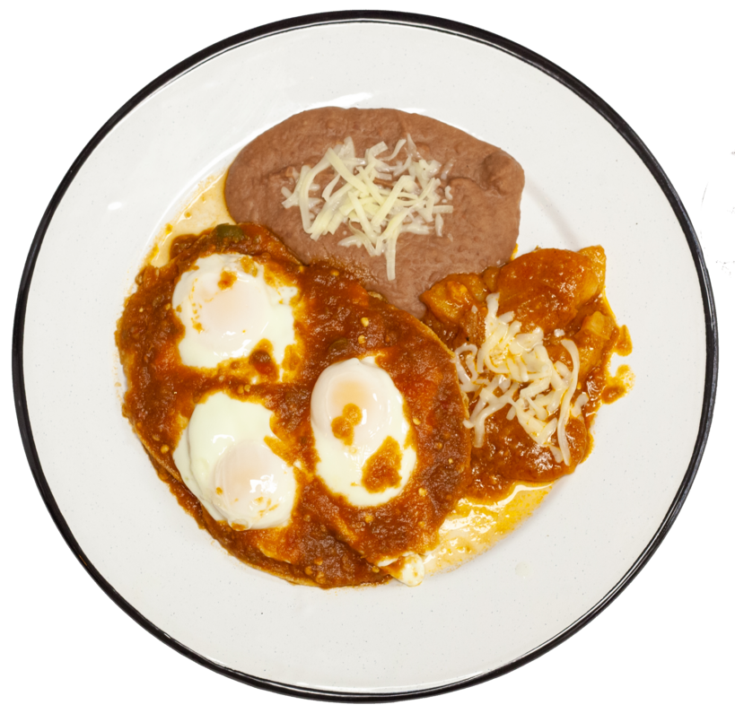Fried tortilla slices cooked in red or green salsa, served with beans, meat of your choice and coffee