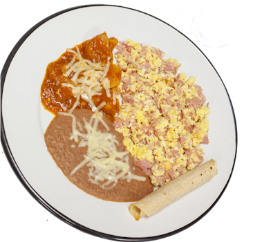 3 eggs scrambled with ham, served with beans, potatoes with hot souce, corn tortillas(5) and coffee