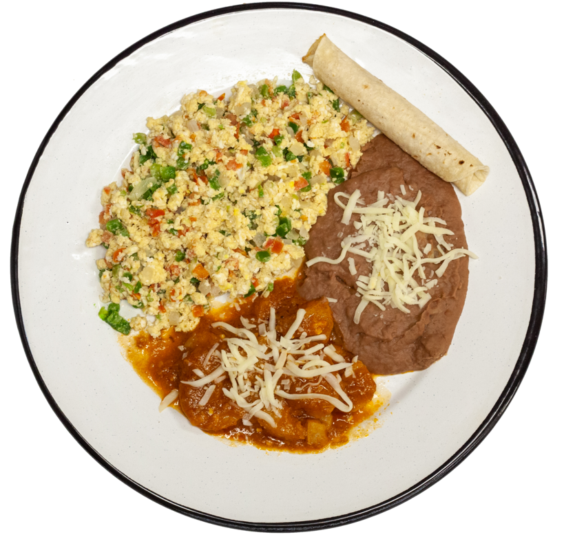 3 eggs scrambled with onion, tomato and jalapeños, served with beans, potatoes with hot souce, corn tortillas(5) and coffee