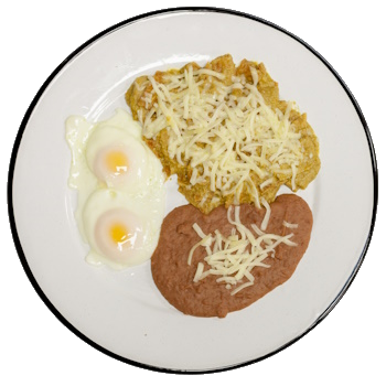 Fried tortilla slices cooked in red or green salsa, served with beans, meat of your choice and coffee
