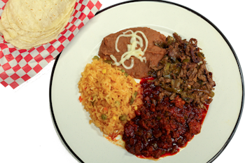 Fried tortilla slices cooked in red or green salsa, served with beans, meat of your choice and coffee