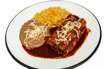 Tortilla bañada en salsa roja o verde acompañada con frijoles, guiso a su elección y café