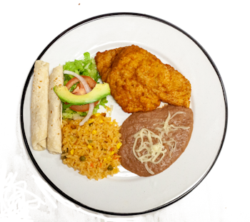 acompañados con frijoles, papas con chile y tortillas de maíz (5) y café.